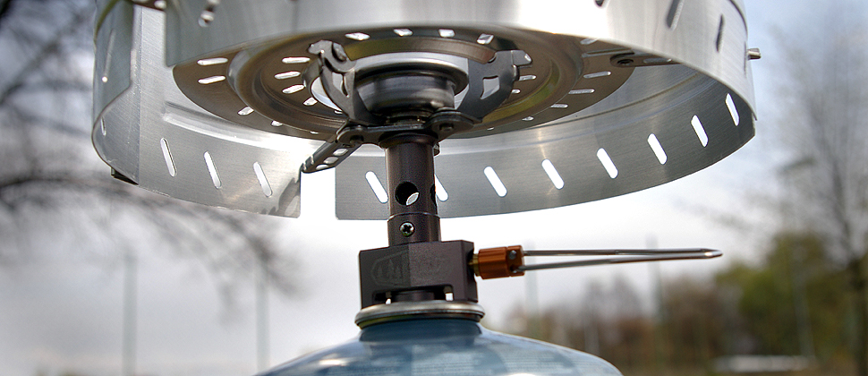 Vařič této soupravy je poměrně výkonný (8768 BTU/hod) se spotřebou paliva na plný výkon 187 g/h. Ale je i snadno regulovatelný, a vařit tak lze i na mírném ohni. Co je na něm výjimečného, je jeho možnost složení do opravdu malých rozměrů. Ramena se poskládají jako křídla a pootočením se přitisknou k tělu, stejně tak se i regulační držák přetočí, hořák sklopí a celek vloží do ochranného sáčku. Jen je nutné se složením počkat, než celý řádně vychladne! (až 10´)