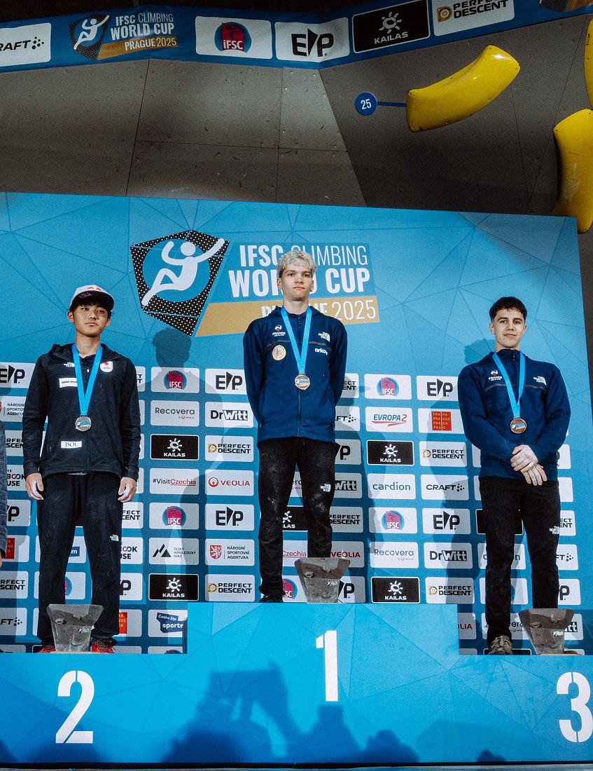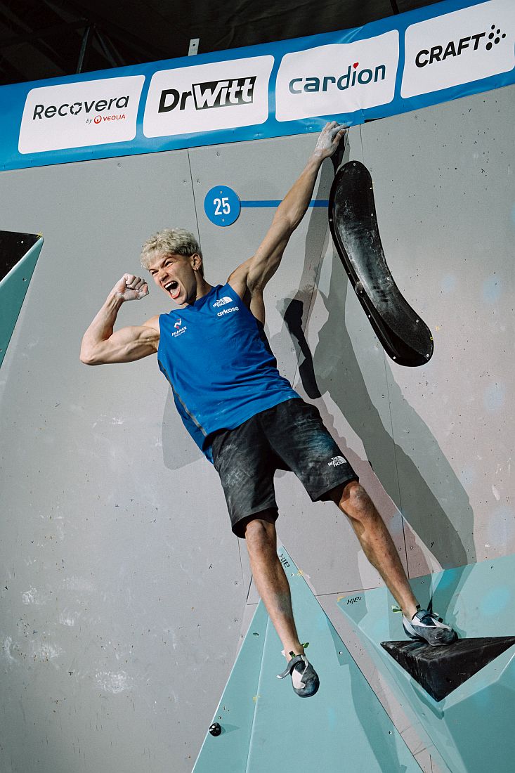 Mejdi Schalck from France won the final of the 2025 World Cup in Bouldering in Prague this evening. Japanese Sorato Anraku was second, French Samuel Richard was third.