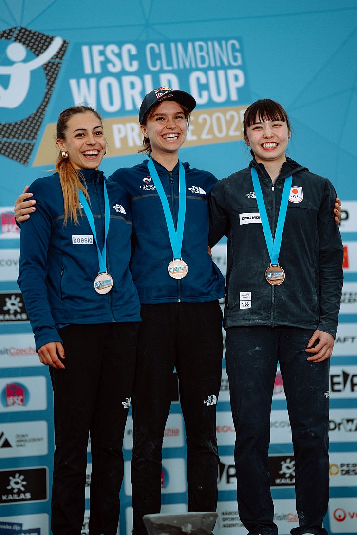 Frenchwoman Oriane Bertone won the World Cup bouldering event in Prague today. Frenchwoman Agathe Calliet was second, and Japanese Melody Sekikawa was third. The women´s final standings were decided by the result of the morning semi-final, as the evening final was canceled due to bad weather conditions.