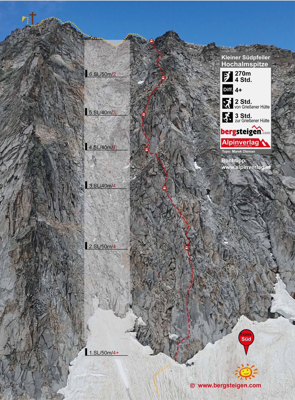 In addition to the existing routes Traumfänger (6a) and Südpfeiler (V) on the main pillar of the south face, they have added another option for climbing the queen of the Hohe Tauern.
