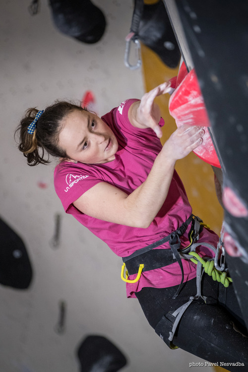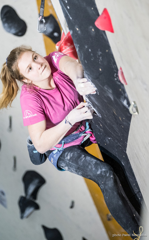 V ženách se lámal chleba ve výlezu z převisu do kolmice. Stavěči tu připravili na první pohled špatně čitelnou sekvenci tří lišt a následné šikminy, okořeněnou dost špatnými nohami. Nejlépe si s problémem poradila domácí Terka Širůčková – šikminu vzala na lištu, podržela ji, a ještě naznačila další pohyb. Získala tím zlato nejen v ženách, ale i v mládeži kategorie B.