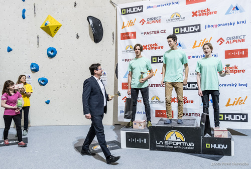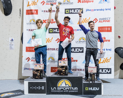 V mužích si pro třetí místo dolezl Štěpán Volf, který překonal výlez z převisu, ale zastavila ho sekvence dvou bočáků, z kterých další pohyb dokázal už jen naznačit. Totožného místa dosáhl i Kuba Konečný, jen o pár sekund rychleji. Zasloužil si tak druhé místo. Martin Stráník zvládl přechod ze zmíněných bočáku do lišty a ještě naznačil přesah do té následující. Martin se tak dostal nejdále a zvítězil, čímž navázal na svůj úspěch z minulého týdne, kdy ovládl první kolo Českého poháru v boulderingu.