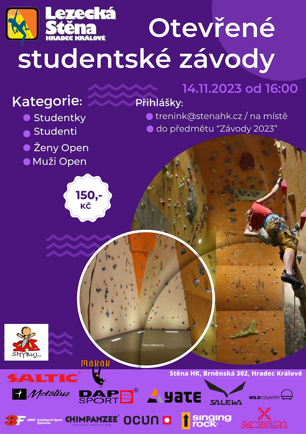 Po krátké odmlce Vám můžeme s radostí oznámit, že se u nás na Lezecké stěně Hradec Králové budou opět konat Otevřené studentské závody!