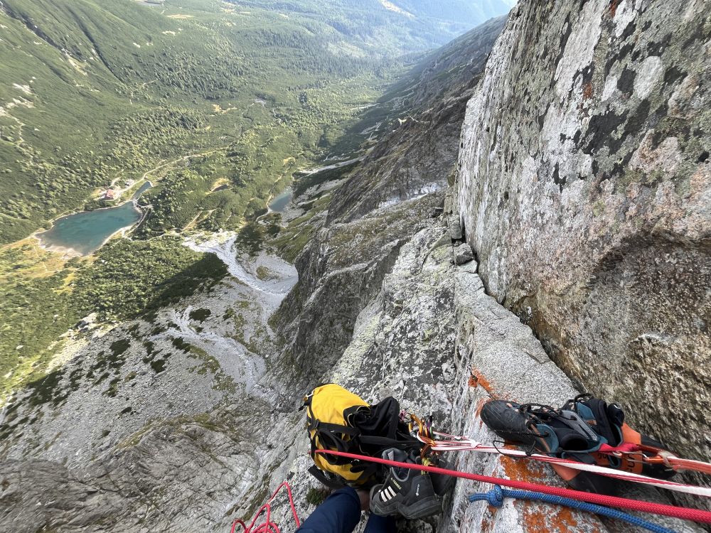 Střih. 28. 8. ráno nastupuju do Superdiretissimy sám, tedy úplně sám nejsem. Je se mnou svině a pěkně těžká – 4 litry vody, 2 lana (singl a půlka), friendy, vklíněnce, expresky, karabiny, blokanty, teplé oblečení, spacák, karimatka, vaření a jídlo. Cesta je na tatranské poměry dlouhá, má 13 délek plus dolez na vrchol Pavúkove veže. Při jištěném sólu je navíc potřeba každou délku vylézt, zafixovat lano na štandu, při slaňování vybírat některé jištění a některé nechat a refixovat na nich loďákem lano, aby při následném žumarování se neprodřel oplet, resp. refixování je nutné také pro diagonální a traverzové délky. Po slanění na původní štand se zruší a žumaruje s tahačákem zpátky nahoru.