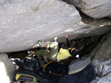 Převislý boulder přes malé lišty nacvičoval Berni víc než dva týdny. Jeden den už měl přelez na dosah, ale spadl v posledním kroku. Poté nasněžilo a k boulderu se musel brodit v hlubokém sněhu. Ani toho neodradilo a svůj projekt si nakonec úspěšně odškrtl. Pokud počítám dobře, tak je to jeho osmé 8C. Více informací o tomto rakouském silákovi najdete v tomto článku .