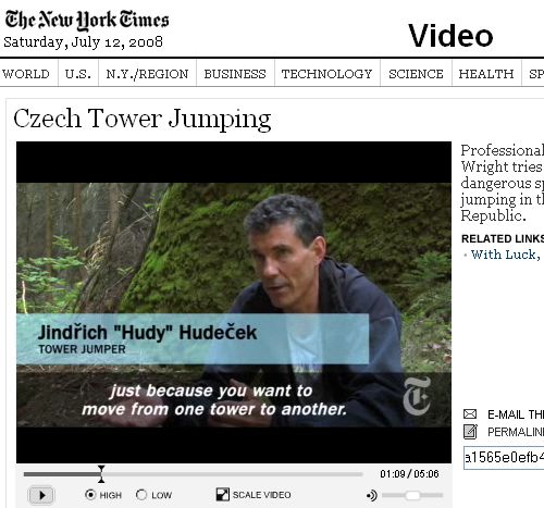 New York Times zveřejnily ve svém on-line vydání videoreportáž o přeskocích na českých pískovcových věžích v Adršpachu. Kromě archívních záběrů je k vidění mj. i aktuální rozhovor s Jindřichem "Hudy" Hudečkem coby českým skokanem.