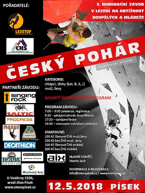 Lezecké centrum LezeTop v jihočeském Písku hostí v sobotu 12. 5. třetí kolo Českého poháru dospělých a mládeže v lezení na obtížnost, které je zároveň posledním nominačním závodem do reprezentace ČR.