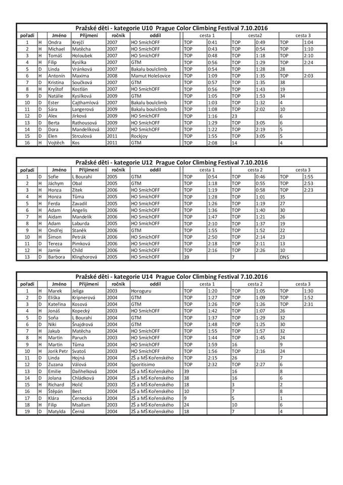 Za kategorii U14 vyhráli Eliška Bulenová (Green Trees Monkeys, lezeckytrenink.cz) a Marek Jeliga (Horoguru, BigWall). Kategorie U12 patřila Báře Zítkové (BigWall, Ocún) a Adamovi Adamovskému (HK Orlová – HO TJ Baník Karviná) a konečně za kategorii nejmenších U10 zvítězili Kurek Malgorzata POL (goCLIMBO) a Jaroslav Šikula (HO SK Prostějov, lezeckytrenink.cz, Flash).