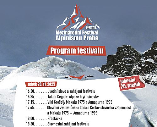 Mezinárodní festival alpinismu Praha 2025 začíná dnes od 16:30 v hotelu International v Praze 6. Dnes je na programu přednáška Jakuba Cejpka, kterému se letos podařilo zkompletovat sbírku výstupů na 82 alpských čtyřtisícovek, či otevření výstav: Češka koča + Česko-slovinská vzájemnost a Makalu 1975 + Annapurna 1995. Zde přinášíme podrobnější program: ... celý článek